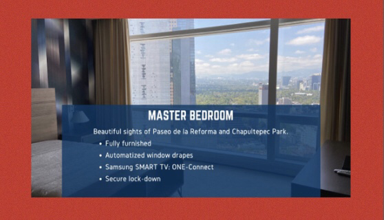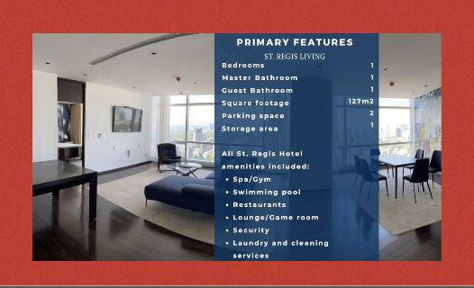 Ubicado en uno de los edificios más exclusivos y lujosos de la Ciudad de México, rodeado de lugares emblemáticos, museos, grandes corporativos, boutiques y galerías de arte con vistas al histórico Paseo de la Reforma, el St. Regis Ciudad de México cuenta con la mejor ubicación siendo un ícono post-modernista de la avenida por su elegancia, prestigio y servicio que esta firma ofrece a sus residentes.