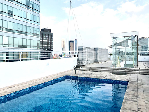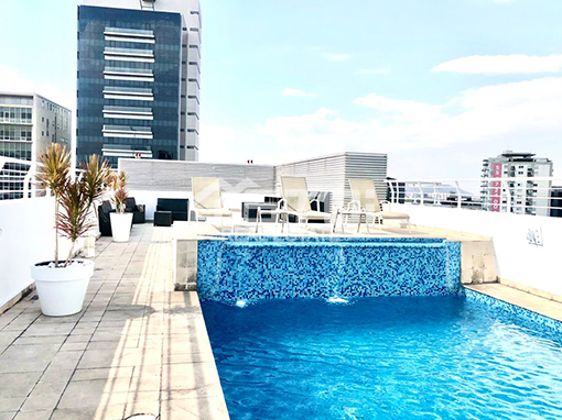 El edificio cuenta con elevadores, gym, alberca al aire libre con una vista espectacular con terraza con mesas, salón con barra-bar y pantallas de TV, ludoteca, spa, vapor para damas y caballeros, estricta vigilancia las 24 horas.